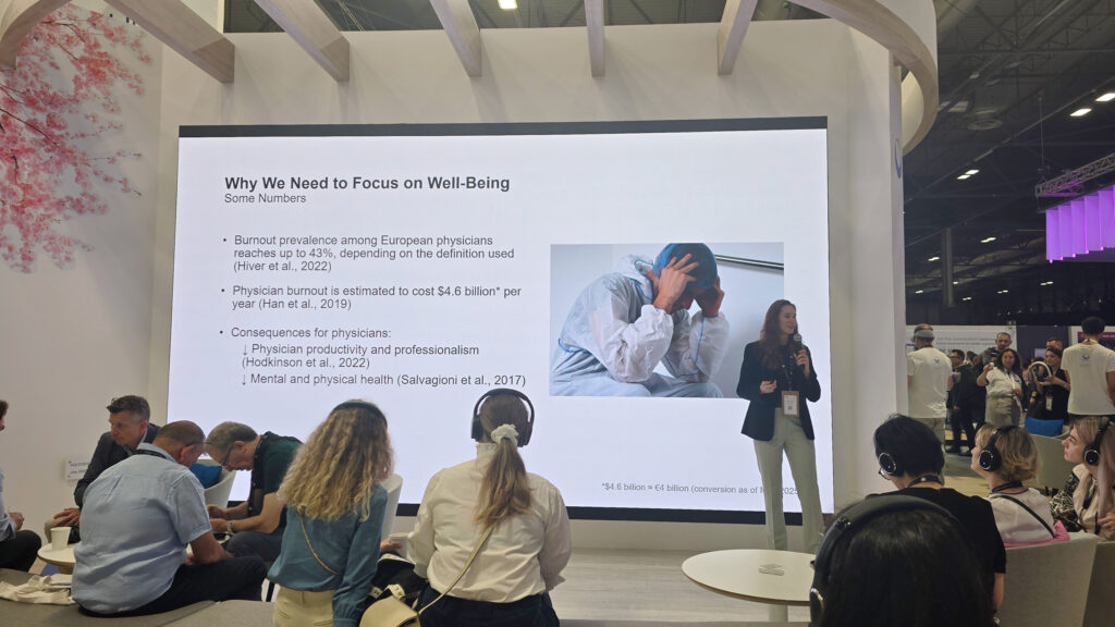 She highlighted the science of burnout, highlighting that burnout prevalence among European physicians reaches up to 43%,1 and physician burnout is estimated to cost $4.6 billion per year.2 Consequences including a decrease in physician productivity and professionalism,3 as well as a decrease on mental and physical health,4 having a knock-on effect for patients in terms of safety incidents and dissatisfaction.3